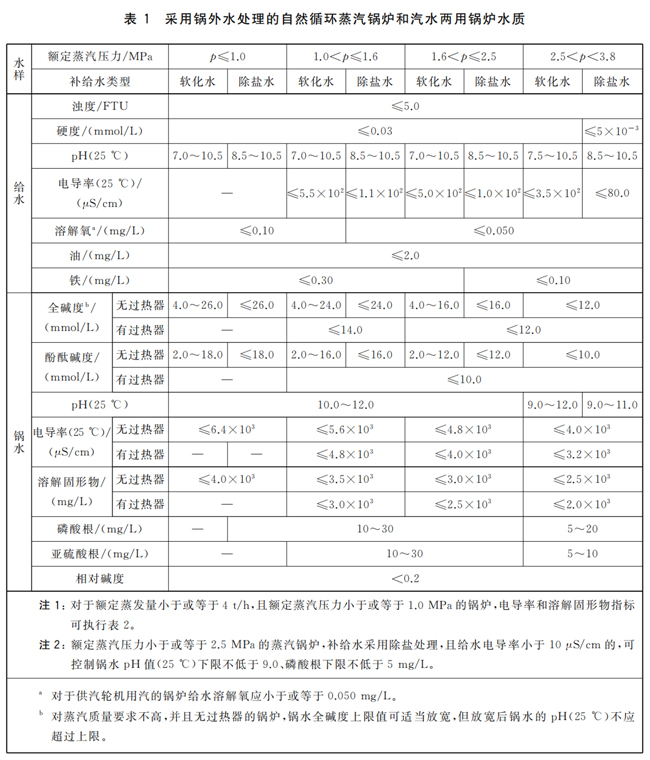 2.1 采用锅外水处理的自然循环蒸汽锅炉和汽水两用锅炉的给水和锅水水质应符合表1的规定。