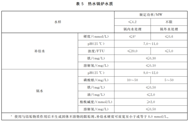 6.1 热水锅炉补给水和锅水水质应符合表5的规定。